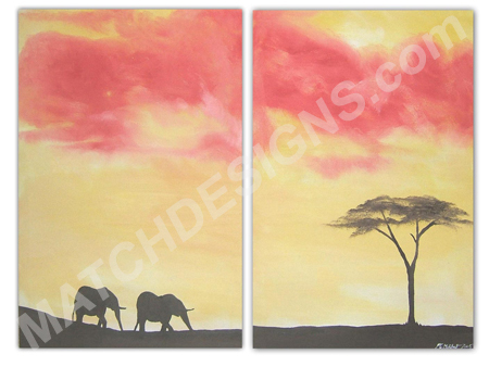 LANDSCAPE ART Title:Elephant sunset 04 Date: 2005 Artist: Paul Matchett Medium: oil on canvas Colour:Brown, yellow, white. Support: Gallery wrapped canvas Size: 12 x18 inches (x2) Price: £85.00 GBP (FREE delivery to the UK only). see delivery